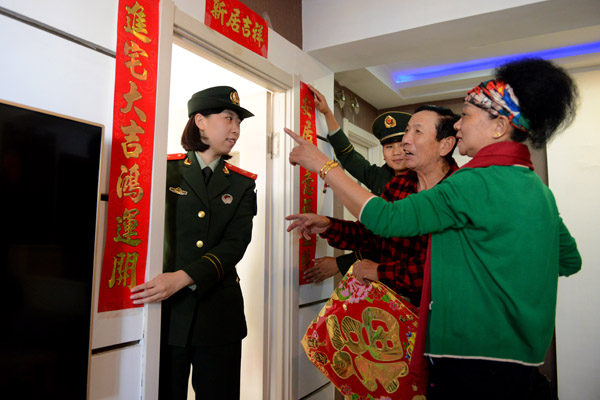 邊防官兵與烈士家屬一起貼對聯(lián)